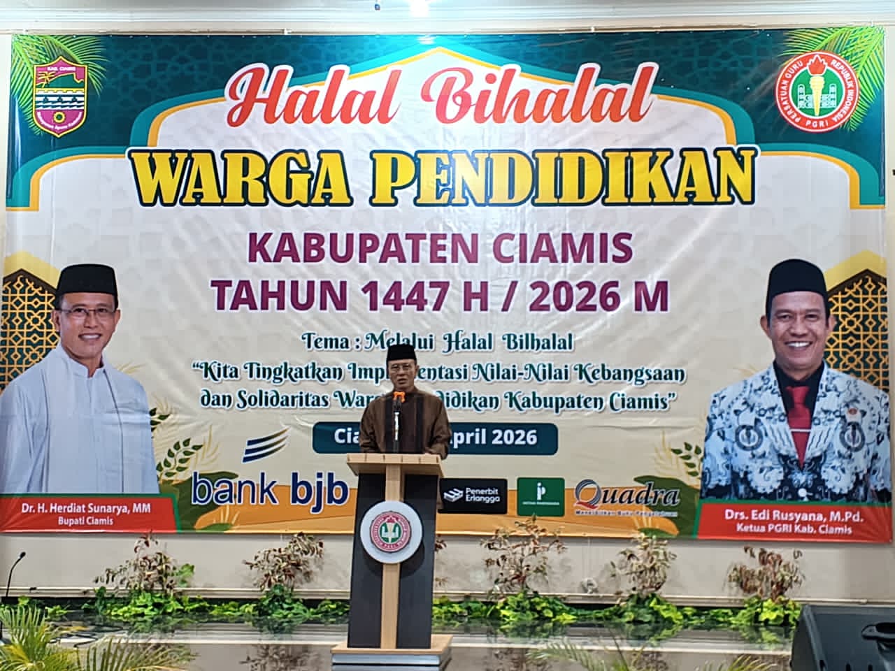 Bupati Ciamis, Herdiat Sunarya, dalam sambutannya menyampaikan ucapan Selamat Hari Raya Idulfitri 1447 Hijriah serta permohonan maaf kepada seluruh tenaga pendidik, khususnya anggota PGRI Kabupaten Ciamis.