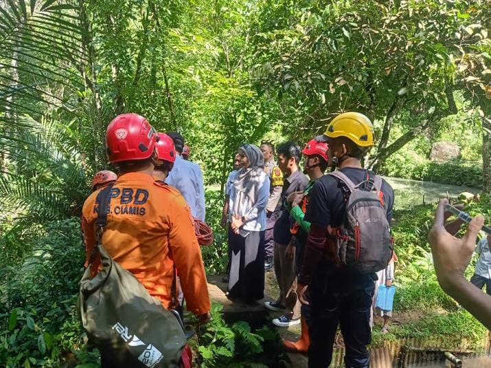 Proses pencarian anak hilang di Perumahan Lembah Medina, Ciamis, diduga terbawa arus.