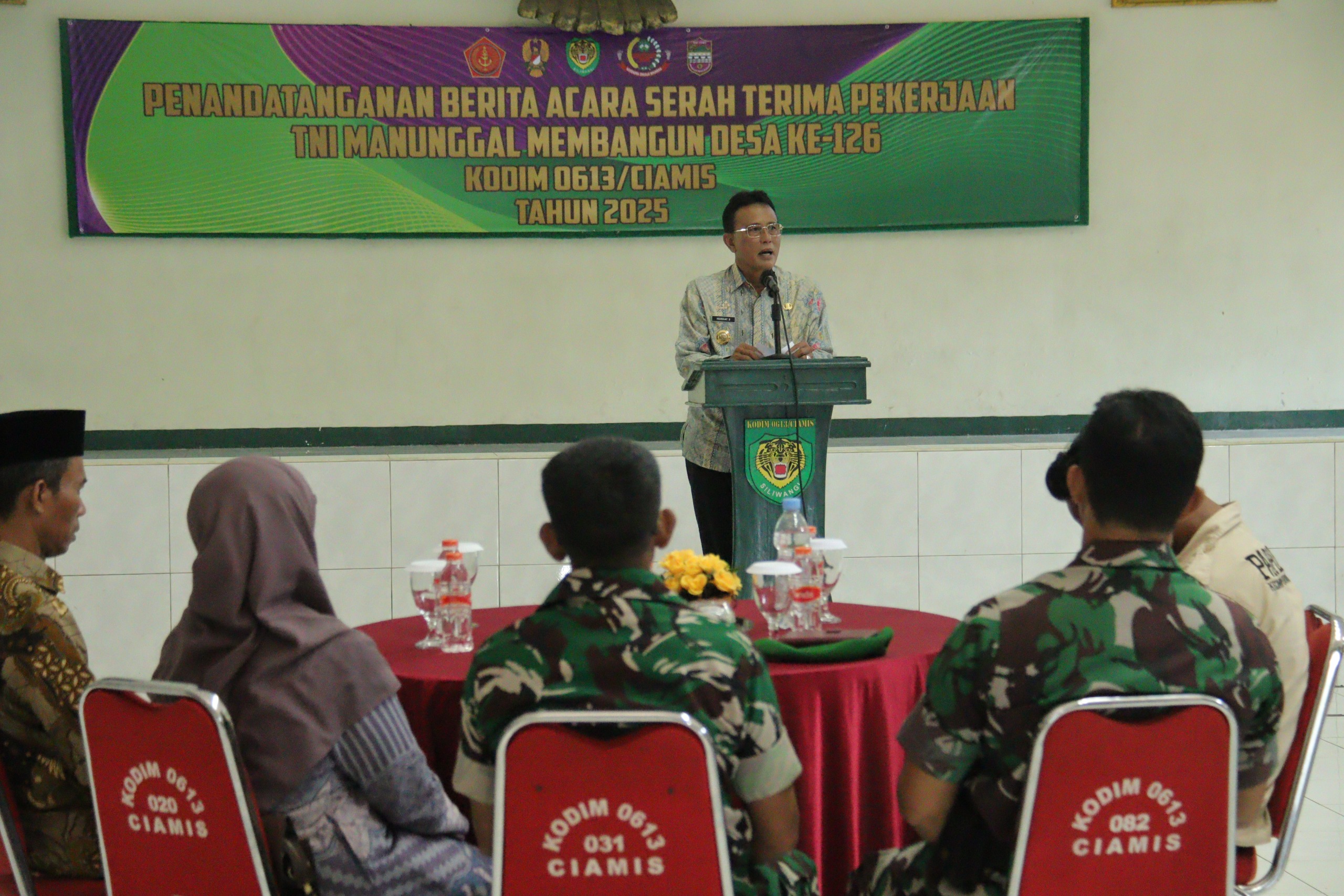 Penyerahan dilakukan oleh Dandim 0613/Ciamis, Letkol Inf. Antonius Ari Widiono, kepada Bupati Ciamis, H. Herdiat Sunarya, dalam seremoni di Aula Kodim 0613/Ciamis. Kegiatan ini menandai berakhirnya TMMD yang dipusatkan di Desa Sukamulya, Kecamatan Purwadadi.