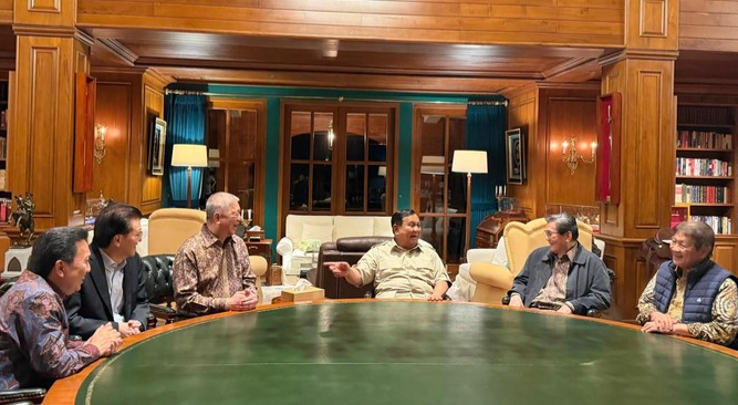 Sebelumnya, pada Senin (9/2) malam, Prabowo juga telah menerima Asosiasi Pengusaha Indonesia (Apindo) di lokasi yang sama. Dalam pertemuan yang berlangsung selama 3 jam itu, Prabowo mengajak sektor industri untuk menciptakan lapangan kerja seluas-luasnya guna menopang ekonomi rakyat.